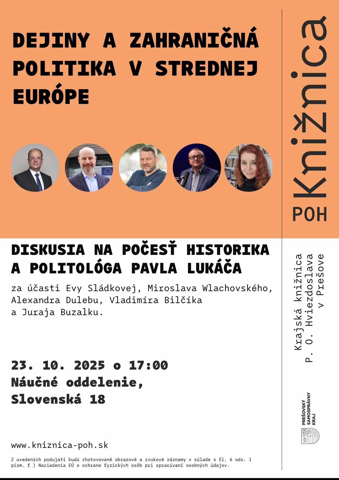 Diskusia na počesť historika a politológa Pavla Lukáča za účasti Evy Sládkovej, Miroslava Wlachovského, Alexandra Dulebu, Vladimíra Bilčíka a Juraja Buzalku.